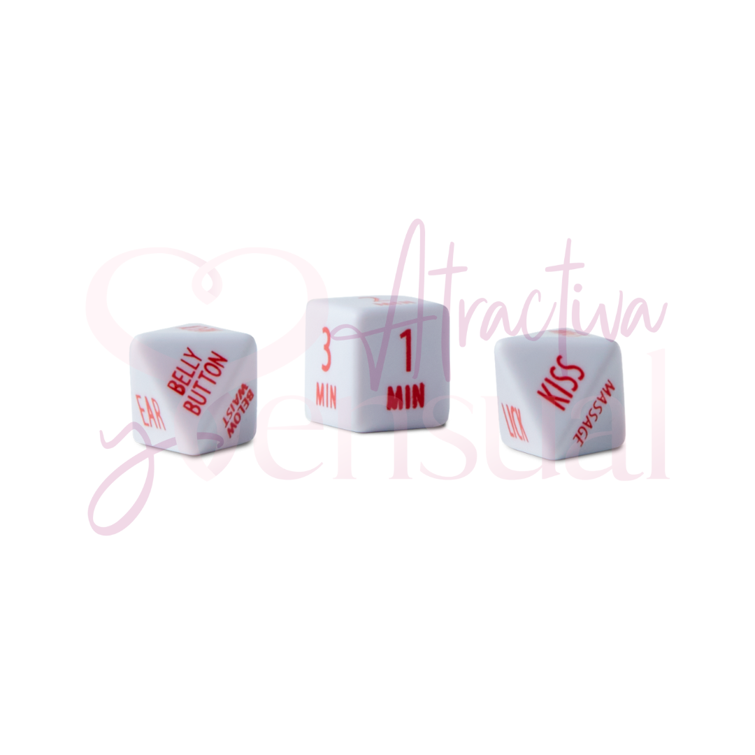 Lleva la noche al siguiente nivel con los dados de juegos previos para tentar y provocar. Este juego incluye 3 dados para guiarte a ti y a tu pareja a través de un momento tentadoramente bueno. Tira para descubrir una acción (como besar o lamer), una parte del cuerpo (como el cuello o la parte interna del muslo de tu pareja) y la cantidad de tiempo para tentarla y provocarla. Luego, es hora de cambiar.